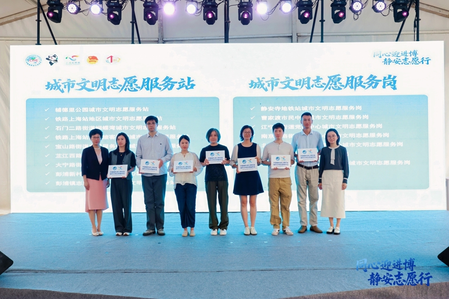 现场,为第七届进博会优秀志愿服务集体、优秀志愿者颁发荣誉证书;为铁路上海站、辅德里公园、重点商圈等第八届进博会城市文明志愿服务站(岗)授牌;静安区进博会内宾接待“蓝精灵”志愿服务队上岗宣誓,用激情昂扬的誓词,生动诠释新时代青年志愿力量。